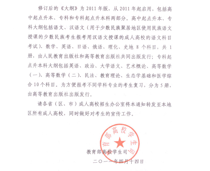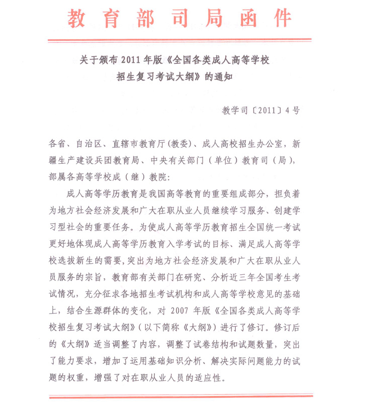 关于颁布2011年版《全国各类成人高等学校招生复习考试大纲》的通